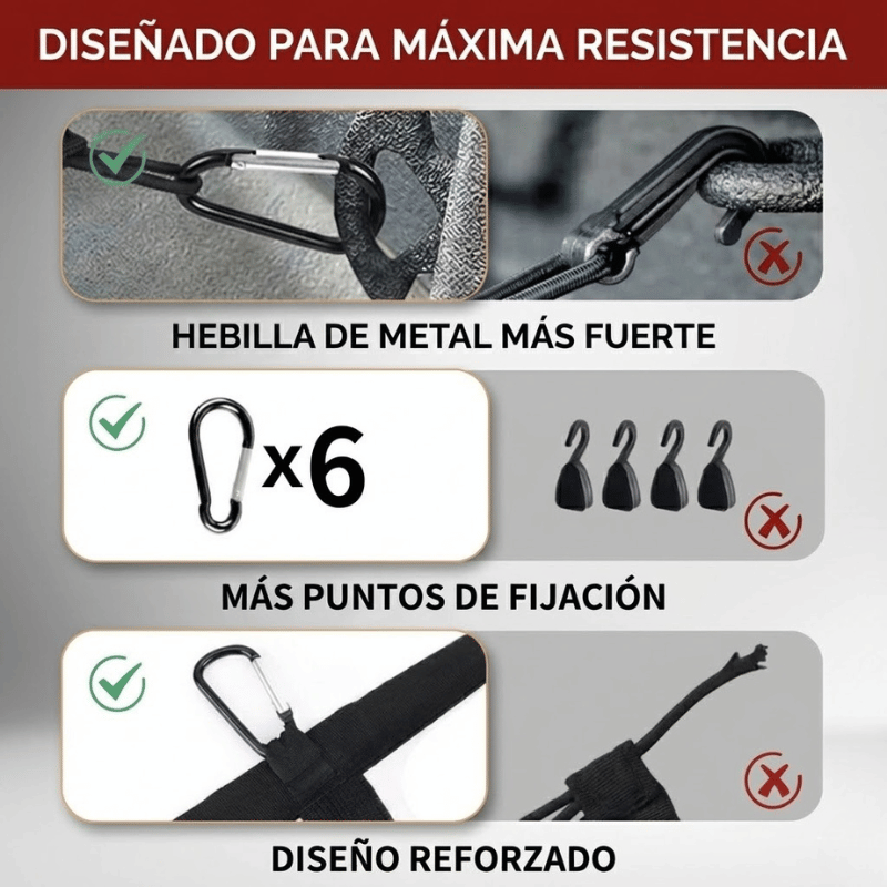¡Sí! Simplemente ponlo sobre la carga, engancha los ganchos a la bandeja o remolque, y listo, en segundos, sin tener que tocar cuerdas ni lonas.